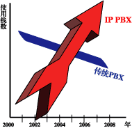 據(jù)美國“Yankee Group”預(yù)測,“2005年IP-PBX的使用線數(shù)將超過傳統(tǒng)PBX。從2001年開始傳統(tǒng)PBX以每年12%的速度在下降,IP-PBX以每年30%的速度增長”。