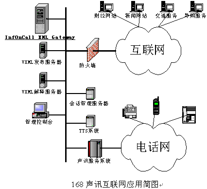 穎科VoiceXML技術(shù)成功應(yīng)用于遼寧電信168聲訊互聯(lián)網(wǎng)系統(tǒng),也是VoiceXML技術(shù)在國(guó)內(nèi)首次成功實(shí)現(xiàn)電信級(jí)應(yīng)用。在原有的聲訊平臺(tái)上,通過新添加的穎科VXML系統(tǒng),可以充分利用VoiceXML的優(yōu)勢(shì),實(shí)現(xiàn)增值業(yè)務(wù)快速得開發(fā)、部署、和更改,借助IXG工具,能夠快速得開發(fā)出互聯(lián)網(wǎng)聲訊業(yè)務(wù)。