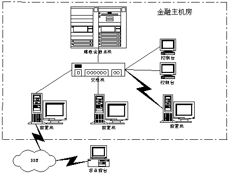 郵政儲(chǔ)蓄金融主機(jī)房主要包含金融主機(jī)、前置機(jī)及網(wǎng)絡(luò)通信設(shè)施。其結(jié)構(gòu)示意圖如下。