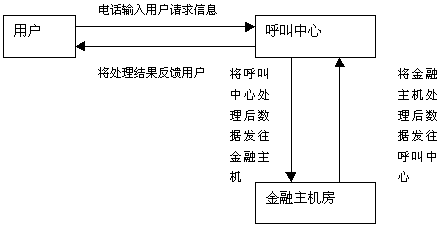用戶通過(guò)撥打電話185連接到185客戶服務(wù)中 心,然后根據(jù)客戶服務(wù)中心的提示信息利用電話按鍵或語(yǔ)音輸入用戶的請(qǐng)求信息。用戶的請(qǐng)求信息傳送到呼叫中心后,呼叫中心會(huì)根據(jù)用戶的請(qǐng)求信息內(nèi)容進(jìn)行處理,如查詢(xún)儲(chǔ)蓄法規(guī)等,然后將處理結(jié)果反饋給用戶,如果牽涉到用戶的帳戶數(shù)據(jù),則呼叫中心將用戶的請(qǐng)求首先進(jìn)行處理,然后將處理后的信息發(fā)送給金融主機(jī)房,由金融主機(jī)根據(jù)呼叫中心傳來(lái)的數(shù)據(jù)進(jìn)行帳務(wù)處理,然后將處理結(jié)果返回給呼叫中心,呼叫中心再對(duì)金融主機(jī)房返回的數(shù)據(jù)進(jìn)行處理成客戶能夠聽(tīng)到的語(yǔ)音信息,將處理結(jié)果傳給用戶。上述流程是一個(gè)單個(gè)處理流程,實(shí)際上跟用戶進(jìn)行交互時(shí),一項(xiàng)業(yè)務(wù)會(huì)有多個(gè)往返的處理流程。