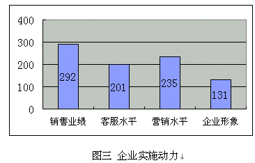 (d)提升企業(yè)形象:很多受訪企業(yè)特別是服務(wù)業(yè),已經(jīng)建立客戶忠誠(chéng)度放在了很重要的位置,但比較其它幾個(gè)直接動(dòng)因,比例偏低,這也似乎說(shuō)明"以客戶為中心"的觀念還沒有"以利潤(rùn)為中心"強(qiáng)烈。