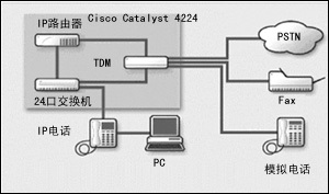 Catalyst 4224結合了24端口快速以太網交換機的功能,即利用Catalyst 2600/3600分支機構路由器、8端口模擬語音網關和縮小的AVVID呼叫管理器等為IP電話提供線路供電能力。所有的部件都集中在一個2U的機柜內,它還具有硬件加速的VPN和防火墻的性能。