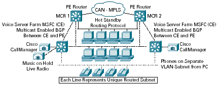 盡管大部分流量都位于VoIP VPN內(nèi)部,但是仍然有一些流量需要在VPN之間傳輸。這種外聯(lián)網(wǎng)流量目前通過PE在VPN之間傳輸,并且通過訪問列表來限制流量的傳輸方向。一個(gè)針對外聯(lián)網(wǎng)連接的防火墻解決方案將提供增強(qiáng)的安全性。BGP被用于為外聯(lián)網(wǎng)連接提供第三層路由冗余。
