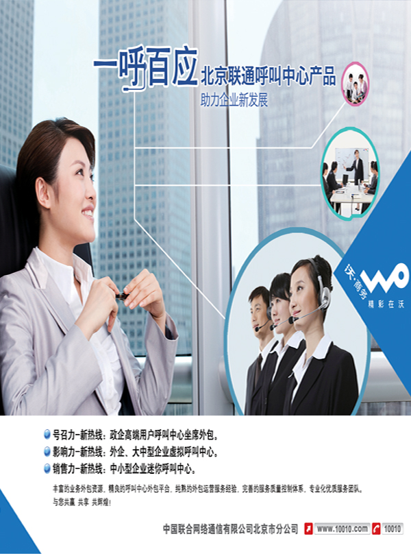 北京聯(lián)通外包呼叫中心的前身為奧運呼叫中心,2008年奧運會結(jié)束,先后承擔(dān)了奧運會、殘奧會賽會志愿者招募咨詢、奧運會、殘奧會票務(wù)咨詢、奧運特許商品質(zhì)詢及“好運北京測試賽”等一系列與奧運會、殘奧會緊密相關(guān)的服務(wù)工作。