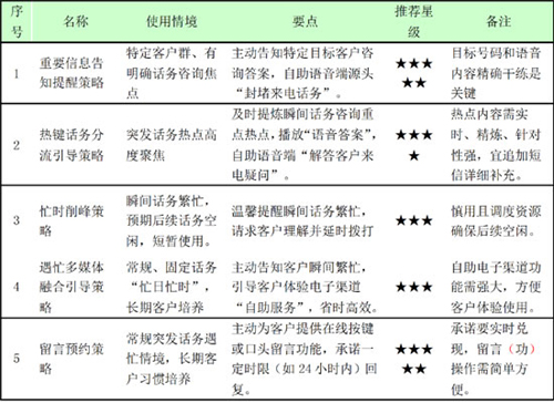 。1)策略內(nèi)容:突發(fā)話務(wù)往往導(dǎo)致瞬間話務(wù)高峰,如能將瞬間話務(wù)“均衡化”,則可有效避免“話務(wù)雪崩”,為此通過錄制IVR語音,引導(dǎo)客戶閑時再撥。【示例】“尊敬的客戶,目前人工話務(wù)繁忙,為節(jié)省您的時間,建議您4小時后再行撥打。給您帶來不便,我們深表歉意”。