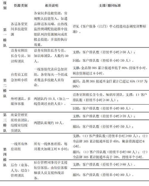第一梯隊:側(cè)重現(xiàn)有話務(wù)科室間“技能協(xié)同”,適度放棄某些品牌,重點保障某品牌;同時一線班組長和日常負(fù)責(zé)業(yè)務(wù)知識管理的同事入線,承接普通話務(wù)。