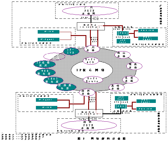 從網(wǎng)絡(luò)架構(gòu)示意圖2中可以看到,每一個(gè)PSTN本地網(wǎng)都是通過(guò)H323媒體網(wǎng)關(guān)連接到IP包交換網(wǎng)絡(luò),再接入到呼叫中心系統(tǒng)中來(lái)的,包括廣東省內(nèi)各個(gè)比較重要的城市(如深圳,珠海,中山,東莞等等)都可以設(shè)一個(gè)H323媒體網(wǎng)關(guān).同時(shí)所有的話務(wù)資源(如多媒體座席和IP-IVR系統(tǒng))都是直接通過(guò)IP網(wǎng)絡(luò)連接到呼叫中心系統(tǒng)中來(lái)的.