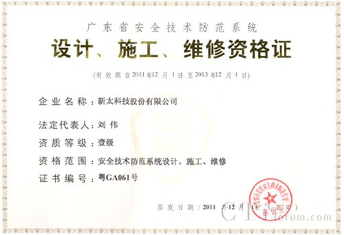 CTI論壇(ctiforum)12月21日消息(記者 張潔):2011年12月,新太科技再傳喜訊,公司順利通過廣東省公安廳認(rèn)定的“廣東省安全技術(shù)防范系統(tǒng)設(shè)計(jì)、施工、維修一級資格證”換證審核,成功獲得新證書。