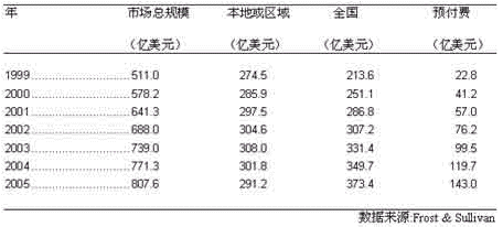 本地或區(qū)域價格方案在我們預(yù)測的時期內(nèi), 將始終是手機(jī)用戶采納的最多的一種方案。 1999年,在美國有5千7百 萬,大約70%的用戶是采用本地或區(qū)域方案, 而該方案產(chǎn)生的營業(yè)額為274.5億美元, 約占市場總規(guī)模的58.6%。Frost & Sullivan 預(yù)計,到2005年, 46.6%的手機(jī)用戶還會使用該種方案, 而該方案產(chǎn)生的營業(yè)額將為291.2億美元,占市場總規(guī)模的比例將縮至36.1%。