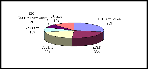 2000年, 美國寬帶互動(dòng)視頻服務(wù)市場中, MCI WorldCom 是最大的贏家,它所占的市場份額約為28%;其次是AT&T 和Sprint,它們的市場份額分別是23%和20%。