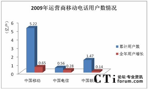 截至2009年12月31日,國內(nèi)移動電話用戶累計達到74738.4萬戶,中國移動的用戶總數(shù)已達到5.22億戶,累計客戶凈增長6503.3萬戶,在三大運營商中,中國移動的用戶保有量和每月新增用戶數(shù)份額仍然最大。