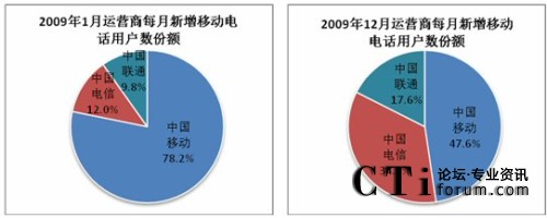 考查三大運營商2009年的每月新增用戶數(shù)份額:中國移動每月新增用戶數(shù)份額從1月的78.2%下降到12月的47.6%,顯然,中國移動每月用戶增速逐漸放緩,而中國電信和中國聯(lián)通的每月新增用戶數(shù)份額呈增長趨勢。