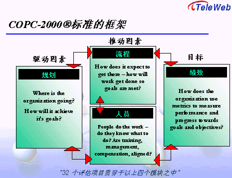 COPC-2000®標準提供呼叫中心規(guī)劃與領導、流程管理、人員管理、績效考核四大類32項指標的評估基準,內容涵蓋財務成本、客戶滿意度、客戶投訴、服務與質量、組織結構、人力資源運用、員工考核及士氣等呼叫中心管理的所有方面。具體架構見下圖。