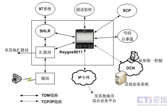 東進(jìn)Keygoe系列多媒體交換機(jī)通過高密度7號(hào)信令鏈路支持、大容量的時(shí)隙交換、多網(wǎng)絡(luò)接口和語音處理完成不同業(yè)務(wù)系統(tǒng)的7號(hào)信令的接續(xù)和解析、話音交換和協(xié)議轉(zhuǎn)換。對(duì)于已經(jīng)進(jìn)行固網(wǎng)智能改造的電信網(wǎng)絡(luò),可以在匯接局將各種業(yè)務(wù)平臺(tái)連接至東進(jìn)Keygoe系列多媒體交換機(jī),并通過東進(jìn)Keygoe系列多媒體交換機(jī)連接至SHLR,實(shí)現(xiàn)多業(yè)務(wù)平臺(tái)上的多業(yè)務(wù)觸發(fā),同時(shí)通過SHLR與97系統(tǒng)以及其他業(yè)務(wù)支撐系統(tǒng)連接起來,實(shí)現(xiàn)業(yè)務(wù)的統(tǒng)一批價(jià)、鑒權(quán)和計(jì)費(fèi);對(duì)于沒有進(jìn)行固網(wǎng)智能化改造的電信網(wǎng)絡(luò),可以在匯接局通過東進(jìn)Keygoe系列多媒體交換機(jī)和SSP提供基于TCP/IP層面的業(yè)務(wù)平臺(tái)互聯(lián)。