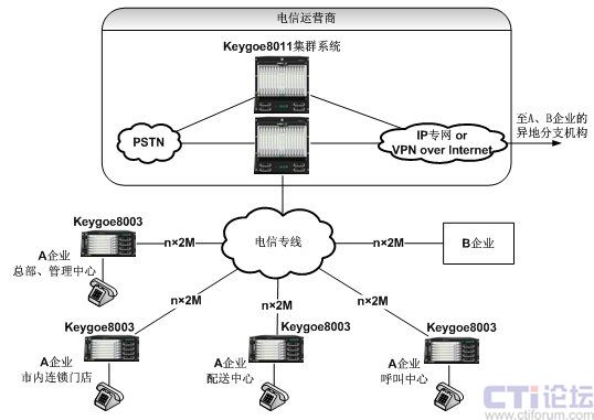 電信運(yùn)營(yíng)商在核心機(jī)房部署由東進(jìn)Keygoe系列多媒體交換機(jī)組成的高性能集群交換機(jī)系統(tǒng),各個(gè)企業(yè)以及各企業(yè)的市內(nèi)分支機(jī)構(gòu)(如管理中心、連鎖門店、配送中心、呼叫中心等)分別配置東進(jìn)Keygoe系列多媒體交換機(jī),并通過電信運(yùn)營(yíng)企業(yè)的2M專線(E1中繼)方式上聯(lián)到電信運(yùn)營(yíng)商核心機(jī)房的交換機(jī)集群系統(tǒng),組成一個(gè)以集群交換機(jī)系統(tǒng)為核心的星形網(wǎng)絡(luò)(如上圖所示)。所有的市話呼入和呼出都通過核心節(jié)點(diǎn)和電信運(yùn)營(yíng)商的中繼通道,為連鎖型商業(yè)企業(yè)提供內(nèi)部話音通訊的統(tǒng)一編號(hào)、統(tǒng)一撥號(hào)、統(tǒng)一維護(hù)和管理,企業(yè)對(duì)外公布統(tǒng)一和便于記憶的號(hào)碼,實(shí)現(xiàn)企業(yè)管理、營(yíng)銷和客戶服務(wù)的統(tǒng)一化和規(guī)范化。核心機(jī)房的高性能集群交換機(jī)系統(tǒng)充分考慮冗余備份,如模塊和整機(jī)設(shè)備的雙冗余,從而提高整個(gè)通信平臺(tái)的高可用性和高可靠性。各個(gè)分支的多媒體交換機(jī)具備本地的獨(dú)立工作能力,即使在中繼線路出現(xiàn)故障的情況下,也能正常的工作。同時(shí),Keygoe系列多媒體交換機(jī)集成了7號(hào)信令、會(huì)議、傳真、語音等豐富的多媒體處理資源,可以為用戶開發(fā)靈活多樣的智能業(yè)務(wù)和增值業(yè)務(wù),豐富了系統(tǒng)的應(yīng)用。