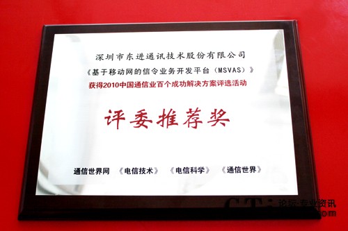 從2010年7月起評(píng)選進(jìn)入征集階段,經(jīng)過長達(dá)3個(gè)月的層層篩選,最終百個(gè)成功解決方案出爐,并由多家主流媒體公示。東進(jìn)技術(shù)“基于移動(dòng)網(wǎng)的信令業(yè)務(wù)開發(fā)平臺(tái)(MSVAS)”解決方案憑借出眾的實(shí)用經(jīng)濟(jì)性、安全可靠性、靈活性和成熟性,經(jīng)過兩個(gè)月網(wǎng)絡(luò)初選,和近百位運(yùn)營商層面專業(yè)人士組成的組委會(huì)技術(shù)終選后獲此殊榮。
