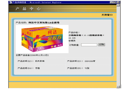 在用戶選擇一個(gè)分類時(shí),此分類下的產(chǎn)品將會(huì)被列出。用戶可以直接在想要購(gòu)買的產(chǎn)品后填寫購(gòu)買數(shù)量,一次可以填寫多個(gè)產(chǎn)品。這樣在處理產(chǎn)品訂購(gòu)的時(shí)候,大大的提高了效率。同樣,用戶也可以點(diǎn)擊詳細(xì)信息鏈接查看產(chǎn)品的詳細(xì)信息(參看圖2)。