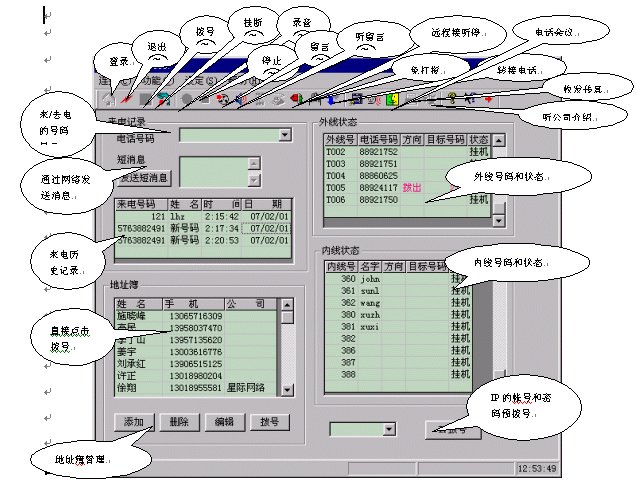 電話控制臺(軟電話),所有系統(tǒng)操作包括電話、查詢、短消息等等都可以通過鍵盤、鼠標操作完成: