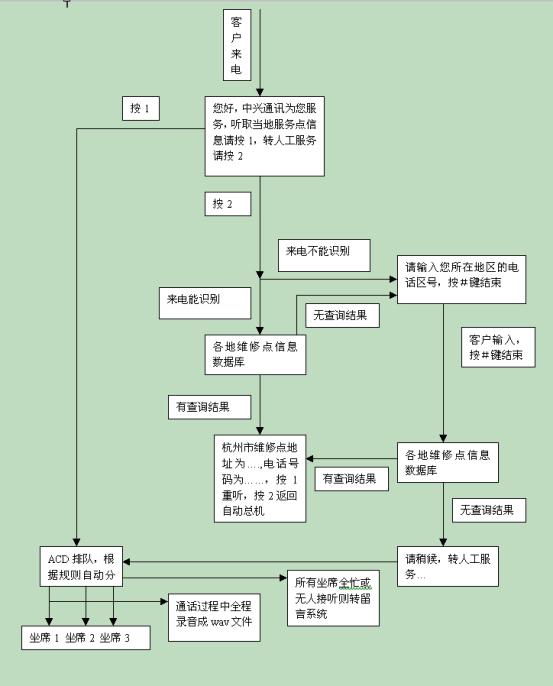 在中興通訊呼叫中心流程設(shè)計上充分體現(xiàn)了CTI技術(shù)以及數(shù)據(jù)庫技術(shù)等IT技術(shù)與星際先進的管理理念的融合。該流程的設(shè)計保證將主動提高服務(wù)品質(zhì)的工作集中于對呼叫者最重要的環(huán)節(jié)――對維修網(wǎng)點信息的咨詢上。它為所有呼叫者提供了詳細、精煉、基本的高品質(zhì)電話服務(wù),同時又根據(jù)電話區(qū)號提供了有針對性的咨詢服務(wù)。