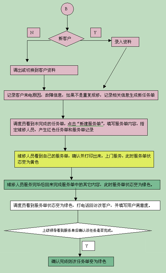 如果是需要上門維修的客戶,點(diǎn)擊"新建任務(wù)單",填寫任務(wù)單上的相關(guān)內(nèi)容,此時(shí)任務(wù)單狀態(tài)為紅色;調(diào)度員看到新任務(wù)單,點(diǎn)擊"新建服務(wù)單",填寫服務(wù)單內(nèi)容,指定維修人員。此時(shí)任務(wù)單狀態(tài)變?yōu)榧t色,服務(wù)單狀態(tài)則為紅色。維修人員看到自己的服務(wù)單,確認(rèn)并打印出來,上門服務(wù),此時(shí)服務(wù)單狀態(tài)變?yōu)辄S色;維修人員服務(wù)完畢后回來完成服務(wù)單中的其它內(nèi)容,此時(shí)服務(wù)單狀態(tài)變?yōu)樗{(lán)色;調(diào)度員看到服務(wù)單狀態(tài)變?yōu)樗{(lán)色,打電話回訪該客戶,并填寫用戶滿意度;上級(jí)領(lǐng)導(dǎo)看到服務(wù)單后確認(rèn)該任務(wù)是否完成。確認(rèn)完成則該任務(wù)單變?yōu)樗{(lán)色,否則再派出一張服務(wù)單。直到任務(wù)完成。