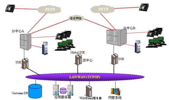 如圖所示,分布式應(yīng)用模式下,各分支節(jié)點的USE負(fù)責(zé)本地的呼叫控制和分配,Global USE負(fù)責(zé)呼叫在不同分支點之間的互專和數(shù)據(jù)控制。
