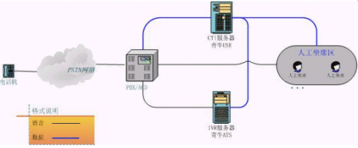 上圖是客服中心較常見的結(jié)構(gòu)圖,相當(dāng)于將初級客服的CT-Server服務(wù)器一分為三。原來的語音板卡由現(xiàn)在真正的PBX替代,青牛USE和青牛ATS則是從CT-Server軟件包中獨立出來,強化各自的核心功能,運行在兩臺單獨的服務(wù)器上(IVR服務(wù)器還是需要語音板卡來處理話路,但語音板卡已經(jīng)不負責(zé)PBX的交換功能了)。這種類型的客服中心可以給客戶更大規(guī)模的、更穩(wěn)定的服務(wù),并且撥入電話的客戶感覺不到系統(tǒng)的變化。