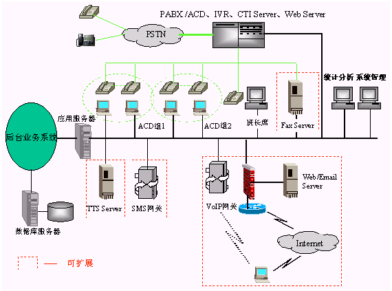 · 一個(gè)完整的呼叫中心解決方案通常由以下核心部分組成:自動呼叫分配(ACD)、交互式語音應(yīng)答(IVR)、計(jì)算機(jī)電話綜合應(yīng)用(CTI)、錄音服務(wù)器、呼叫管理(CMS)等。