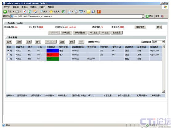 3.模塊界面劃分清晰:Monitor監(jiān)控模塊分為內(nèi)線監(jiān)控、外線監(jiān)控、虛通道監(jiān)控、技能組監(jiān)控和IVR監(jiān)控共五大類。各類別功能獨立運行,可根據(jù)企業(yè)對聯(lián)絡(luò)中心班長的職責劃分,對各類技能組、項目組的班長登錄提供有區(qū)別的監(jiān)控頁面,從而為每位班長的恪盡職守提供了良好的保證。