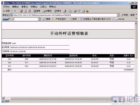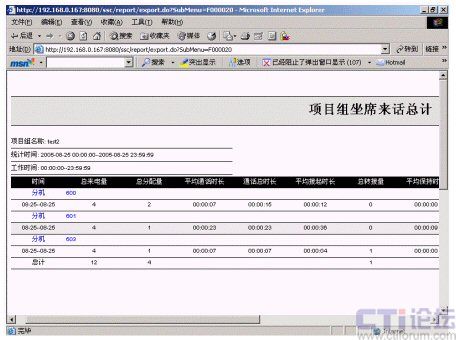 2.項目組外撥分析:包括手動外呼話費明細表、手動外呼話費總計表、項目組手動外呼日報告、項目組自動外呼日報告、項目組座席外撥總計、自動外呼話費明細表、自動外呼話費總計表、座席外呼日報告等。該統(tǒng)計報表分別提供了針對手動和自動的外撥話務、話費統(tǒng)計,分類明確,統(tǒng)計方便。