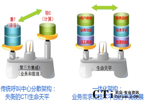 因此很長一段時間以來呼叫中心都作為語音通訊的分支之一而存在,而這種定位給呼叫中心的生命力帶來了不平衡的發(fā)展,根源就在于“輕C重T第三方集成I”的格局:語音處理性能和功能強大,計算能力和數(shù)據(jù)處理弱,因此將業(yè)務(wù)集成和數(shù)據(jù)集成交由第三方承擔。因此很長一段時間,造成呼叫中心在企業(yè)購買之后對業(yè)務(wù)應(yīng)用的適應(yīng)能力差、業(yè)務(wù)發(fā)展和變化時系統(tǒng)穩(wěn)定性變的無法保證。