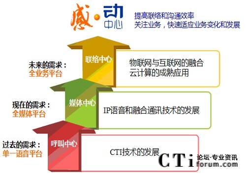 這是“感•動中心”的主旨,完全以客戶的業(yè)務(wù)為出發(fā)點,體現(xiàn)“以客戶為中心”的理念。而“全景中心”、“聯(lián)絡(luò)中心”等以純技術(shù)為中心,還停留在多媒體通訊和UC通訊手段融合層面,只是新增加了一些新方式的接入等技術(shù),對于客戶業(yè)務(wù)的融合和適應(yīng),并沒有任何提升。