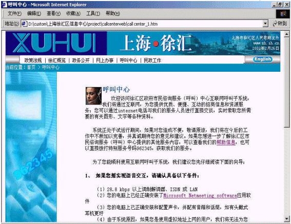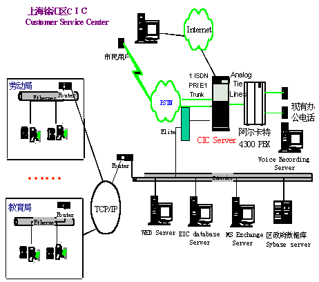 上海市徐匯區(qū)市民咨詢(xún)(呼叫)中心的第一期工程包括語(yǔ)音自動(dòng)應(yīng)答IVR、按需傳真Fax on Demand、語(yǔ)音郵件Voice Mail、網(wǎng)頁(yè)互動(dòng)Web Interaction、座席屏幕彈出Agent Screen Pop、報(bào)表以及語(yǔ)音記錄等功能。該中心具有以下特點(diǎn),很好地滿足了徐匯區(qū)政府的要求。