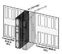 服務(wù)器刀片間的熱備份 背板的各種總線往往會(huì)分成兩段,每段有不同的SBC控制。在背板上存在兩個(gè)特殊槽位,在這些槽位上的SBC同時(shí)連接到這兩段總線上,正常狀態(tài)下一個(gè)活動(dòng)的SBC在控制兩段總線和總線上的設(shè)備,另一個(gè)SBC處在備份狀態(tài),如果活動(dòng)的SBC出現(xiàn)故障,備份SBC會(huì)接管兩段總線和應(yīng)用。參見(jiàn)圖2。
