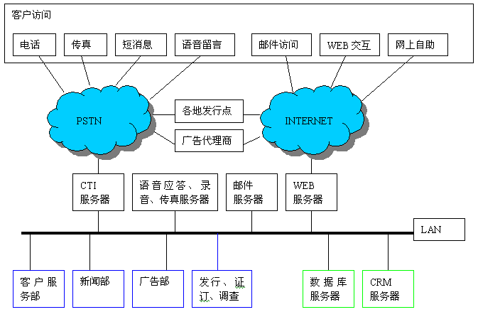 硬件方面,采用價格經(jīng)濟、功能靈活的基于語音板卡的呼叫中心平臺。在軟件方面,采用高可靠性的實時LINUX操作系統(tǒng)。具有高效、穩(wěn)定、安全以及功能齊全等特點。坐席端軟件實現(xiàn)了強大電話處理功能,支持實時錄音、兼聽、強插、強拆等應用;跒g覽器的瘦客戶端與CRM的客戶界面完美融合。并且提供詳盡的報表功能。支持智能化路由、多種排隊策略的選擇,實現(xiàn)與CRM無縫結合。