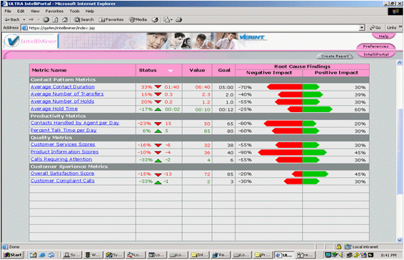 IntelliMiner使用專利的數(shù)據(jù)挖掘技術(shù),自動分析導(dǎo)致呼叫中心關(guān)鍵行為指標(KPI)和呼叫中心設(shè)定目標的因素及其關(guān)系和影響。所分析的數(shù)據(jù)揭示了導(dǎo)致呼叫中心KPI表現(xiàn)的潛在原因,例如過長的通話時間,過多的轉(zhuǎn)接次數(shù),過長的保持時間,降低生產(chǎn)力和降低客戶滿意度。針對分析的結(jié)果,用戶可以去回放相關(guān)的呼叫,找到導(dǎo)致這些因素的原因所在。