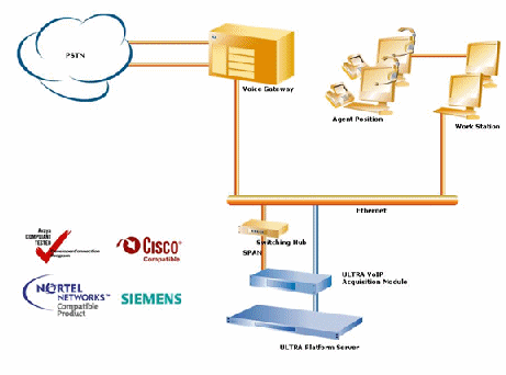 ULTRA平臺的VoIP錄音方案可真正實現(xiàn)純軟件解決方案,可由客戶自行配置符合要求的錄音服務(wù)器,安裝ULTRA平臺的軟件即可。另外,對于不能提供具備SPAN功能的網(wǎng)絡(luò)使用環(huán)境,ULTRA平臺也可提供相應(yīng)的模塊產(chǎn)品(ULTRA