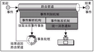 在路由管道中流轉著加載了業(yè)務的工作流事件。事件按照事先定義的路由規(guī)則流轉,事件的路由規(guī)則定義了事件在路由管道中可以?康摹罢九_”,同時定義了事件到達“站臺”時可以領取并處理加載在事件上的業(yè)務的角色。事件從始發(fā)站臺進入路由管道,經過一個或多個中間站臺,最后到達終點站。事件每?恳粋站臺,相關人員領取事務,并進行處理后重新裝載事務,觸發(fā)事件向下一個站臺流轉,除非事件已經到達終點站。