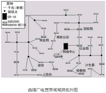網(wǎng)絡(luò)建設(shè)的第一期工程結(jié)束后,本地多媒體寬帶骨干網(wǎng)以曲靖市政府內(nèi)的機(jī)房作為中心機(jī)房。核心機(jī)房采用支持千兆以太網(wǎng)、SDH及ATM接口的高檔交換式路由器ER-16。主干光纖沿市區(qū)鋪設(shè)成為一個星形鏈路,以便在不久的將來能夠?qū)⒂嬌腿朔擂k的光纖連接起來形成一個環(huán)狀鏈路。市區(qū)內(nèi)共設(shè)43個光節(jié)點,各鄉(xiāng)鎮(zhèn)有一個光節(jié)點,以92條單模光纖直接連入核心機(jī)房的交換式路由器,由此與核心機(jī)房形成一個星狀拓?fù)浣Y(jié)構(gòu)。