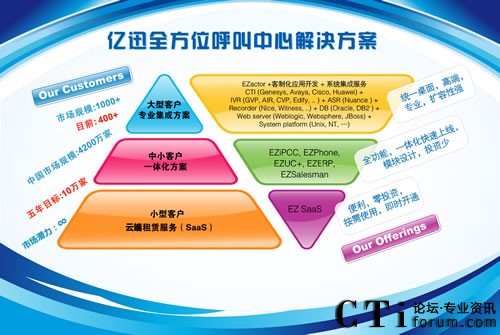 Service Software”;而“易之愛彼喜喜”及“易之風”產(chǎn)品,顧名思義,就是億迅推出基于CESS理念的呼叫中心產(chǎn)品EZIPCC及EZPhone的中文注釋,因為簡單容易,讓客戶更喜歡;“CHANGE”不僅代表了億迅發(fā)展的這11年一直秉持創(chuàng)新與改革的經(jīng)驗哲學,也代表了億迅自主研發(fā)的核心CRM產(chǎn)品“EZactor”在高端市場與主流戰(zhàn)略合作伙伴的關系,其中的“C”,是指CISCO;“H”指Huawei;“A”指“AVAYA”;“N”指Nuance;“G”指Genesys;而最后的“E”,則代表了eSOON。
