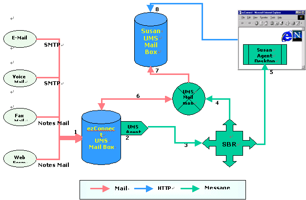 各類外部語音、郵件、WEB、傳真等信息進(jìn)入呼叫中心會以相應(yīng)的格式直接被放入ezConnect統(tǒng)一郵件服務(wù)器(1),消息經(jīng)過UMS Agent 模塊被提取出信息主題和關(guān)鍵字(2),這些主題和關(guān)鍵字被送入基于技能的路由選擇模塊SBR(3),由SBR進(jìn)行分析,選擇出最合適服務(wù)的座席(例如是Susan);之后SBR通知郵件轉(zhuǎn)發(fā)器(4)去ezConnect統(tǒng)一郵件服務(wù)器中取相應(yīng)的郵件(6),將郵件放入最佳座席(Susan)的UMS信箱中(7)(8),與此同時(shí)座席Susan的界面上顯示出她有一封新的郵件(5)。至此,完成了座席Susan 接收UMS信件的全過程。