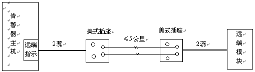 見下圖,遠(yuǎn)端模塊與告警主機通過二蕊電話線相連,連線距離可達(dá)5公里,連接不分極性,可正接或反接