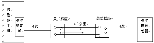 溫、濕度傳感器通過四蕊電話線與告警器主機相連。兩者距離很近時,將傳感器接線插入主機溫、濕度告警接口即可。若距離不夠長時,可按上圖一對一的加長連線,連線距離可達(dá)3公里。