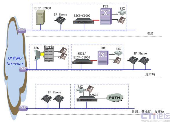 在省局我們采用EICP-S2000或EICP-C1000作為整個系統(tǒng)的核心服務(wù)器/控制器,并可與原有PBX對接;在地市局有PBX的地方采用C1000、SEG1或EEG設(shè)備,或用IP話機直接放號;在縣局、營業(yè)廳、辦事處沒有PBX的地方采用SAG32/SAG8提供模擬用戶接入,或直接采用IP話機。
