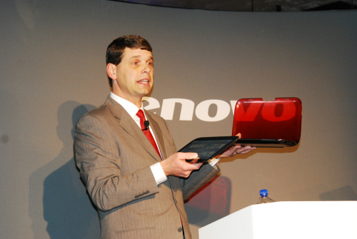 圖:聯(lián)想集團(tuán)COO Rory Read向與會者展示聯(lián)想IdeaPad U1混合筆記本