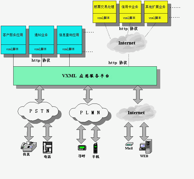 2000年3月由AT&T,Lucent,Motorola,IBM四家公司發(fā)起并提出的VoiceXML標(biāo)準(zhǔn)語言為語音增值業(yè)務(wù)的發(fā)展帶來了新的生機(jī)和變化。由于VoiceXML是XML語言的分支和子集,因此天然可以與因特網(wǎng)無縫連接。這使得傳統(tǒng)的語音業(yè)務(wù)可以無限擴(kuò)展到龐大的互聯(lián)網(wǎng)體系中,可以真正“讓我們用聲音傾聽互聯(lián)網(wǎng)”。