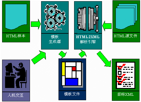 HTML2XML1.0中包括了兩個(gè)工具:HTML2XML模板生成器和HTML2XML解析引擎。通過(guò)該HTML2XML模板生成器的GUI界面和HTML2XML解析引擎,將HTML文件中的<Table>標(biāo)記中的數(shù)據(jù),根據(jù)指導(dǎo)性文件,轉(zhuǎn)換成XML格式數(shù)據(jù),供其他應(yīng)用程序進(jìn)行進(jìn)一步處理。