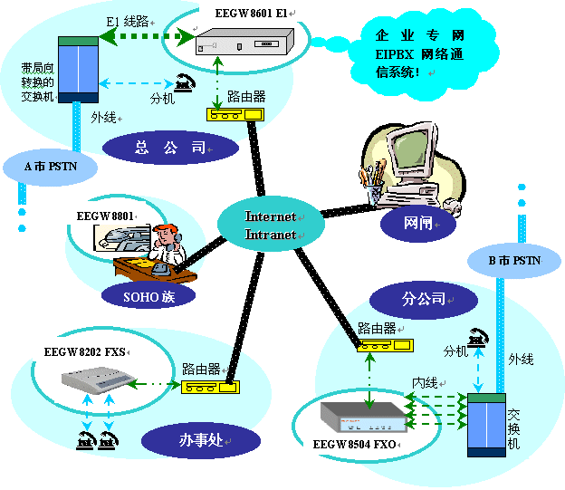SOHO,全稱small office home office。這是現(xiàn)代生活中的產(chǎn)物,一種情況是規(guī)模較大的公司在全球各地設(shè)置辦事機構(gòu),方便本地的業(yè)務(wù)聯(lián)系和處理日常事宜;另一種情況是個人利用自己的業(yè)務(wù)知識和關(guān)系,開設(shè)一個家庭辦公室,聯(lián)系代理全球各地同行業(yè)產(chǎn)品;還有一種情況是異地分居的親友和朋友間的聯(lián)系。這三種情況的業(yè)務(wù)聯(lián)系廣泛,并且通信量大,所以非常適合采用EIPBX網(wǎng)絡(luò)通信系統(tǒng)節(jié)約電話費用。