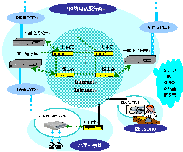目前,在全球各地蓬勃發(fā)展起一項新興行業(yè)——IP網(wǎng)絡(luò)電話服務(wù)商,他們利用遍布全球、資源豐富的Internet / Intranet網(wǎng)絡(luò),組織自己的IP電話核心網(wǎng)絡(luò),將該網(wǎng)絡(luò)的服務(wù)開放給各地的公眾。其核心網(wǎng)絡(luò)的網(wǎng)關(guān)完全遵照ITU-T H.323標準,可以解決電話號碼與IP地址的映射,IP地址解析,路由尋路等問題。能夠?qū)崿F(xiàn)SOHO族通過該網(wǎng)絡(luò)接入全球各地的市話。