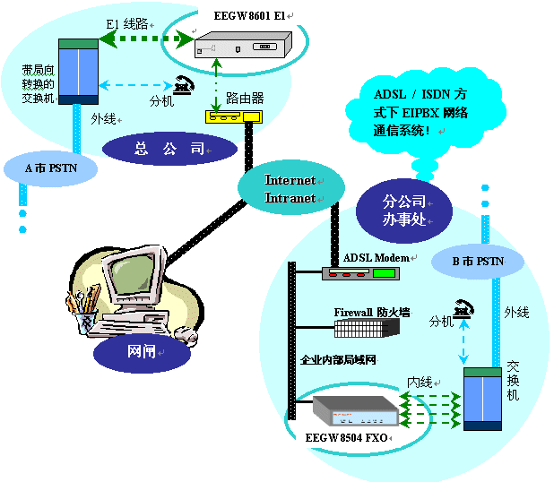 為實現(xiàn)地理位置分散的各企業(yè)分支機構(gòu)間的語音通信,節(jié)約企業(yè)內(nèi)部的通信成本和管理成本,許多公司在選擇ADSL或ISDN等其他寬帶接入技術(shù)接入Internet,同時希望利用該網(wǎng)絡(luò)建立內(nèi)部的EIPBX網(wǎng)絡(luò)通信系統(tǒng)。
