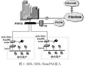 ADSL、SDSL、HomePNA接入方法都是利用普通電話線,采用頻分復用等技術(shù),將電話線分成多個傳輸通道進行通信,它適用于無綜合布線的建筑物。這三種接入方式都可以在同一電話線上同時傳輸數(shù)據(jù)和語音。ADSL技術(shù)在一條電話線上最多可以實現(xiàn)上行1M、下行8M的不對稱高速數(shù)據(jù)傳輸;SDSL在一條電話線上能達到2M的上下行對稱傳輸速率,并且可以將多條電話線捆綁,實現(xiàn)2M、4M、6M、8M等多種傳輸速率;HomePNA在一條電話線上能達到1M的上下行對稱傳輸速率,尤其適用于小型企業(yè)和家庭用戶。以太網(wǎng)接入主要適用于有綜合布線,共享帶寬接入的情況,一般在樓內(nèi)機房配置出口路由器和交換機,在每層配置樓層交換機,將用戶直接連接到10/100M交換機端口,實現(xiàn)10/100M帶寬到桌面。如圖1所示。